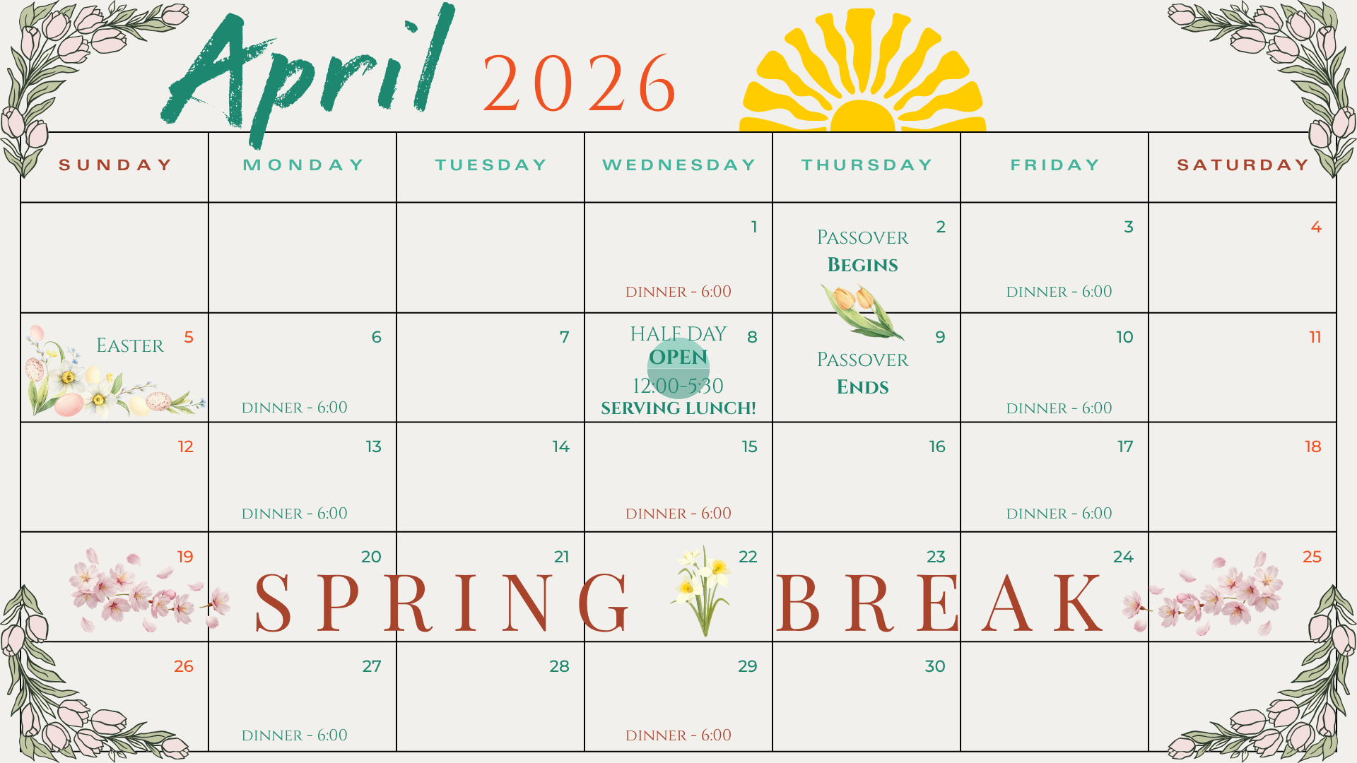 Tuesdays and Thursdays: 2:30-5:00 *No Dinner*