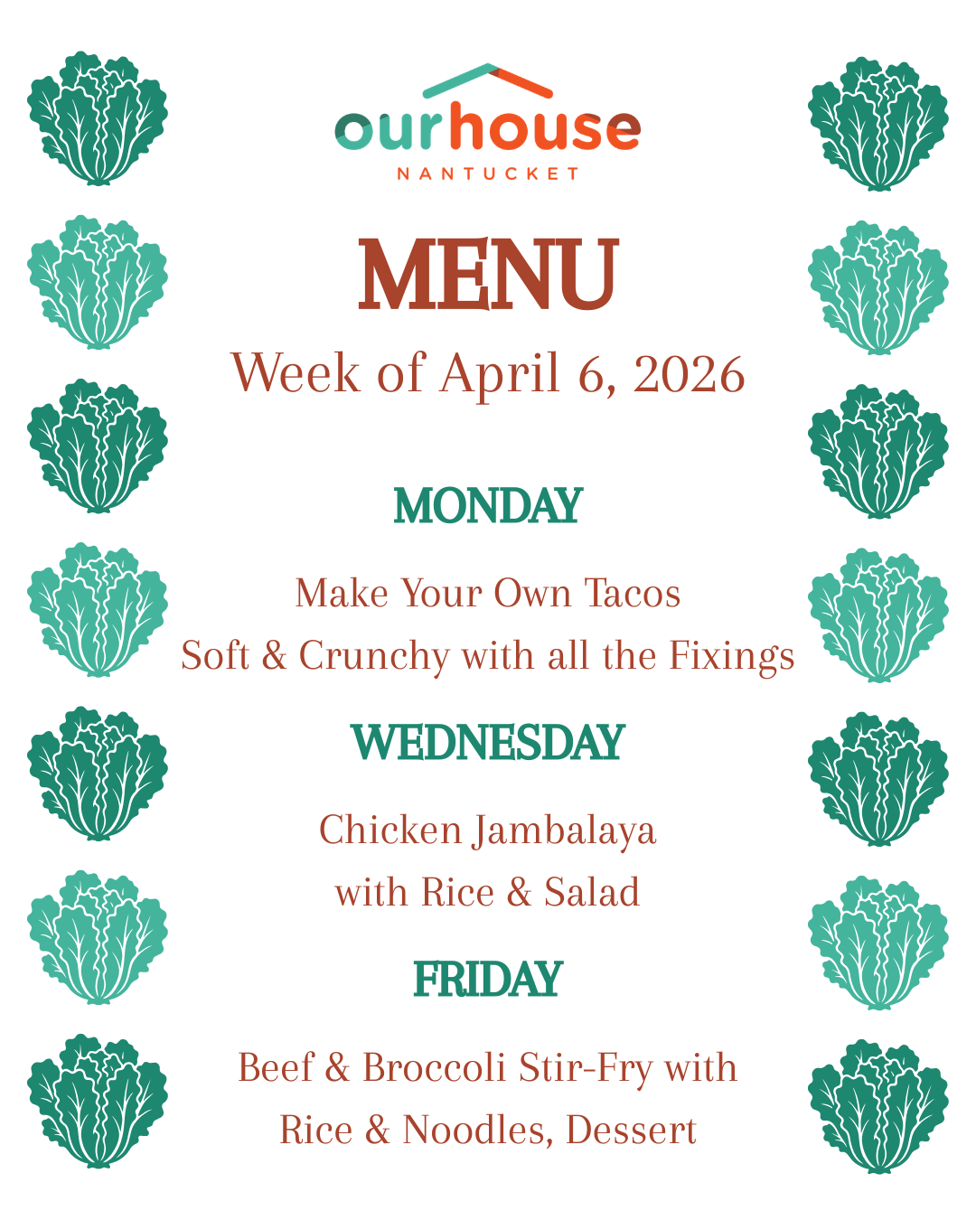 Every day we have different snacks and drinks available. We also serve dinner Mondays, Wednesdays, and Fridays at 6:00.